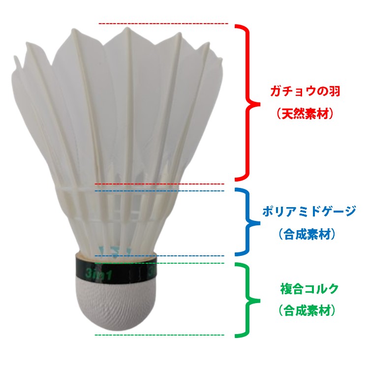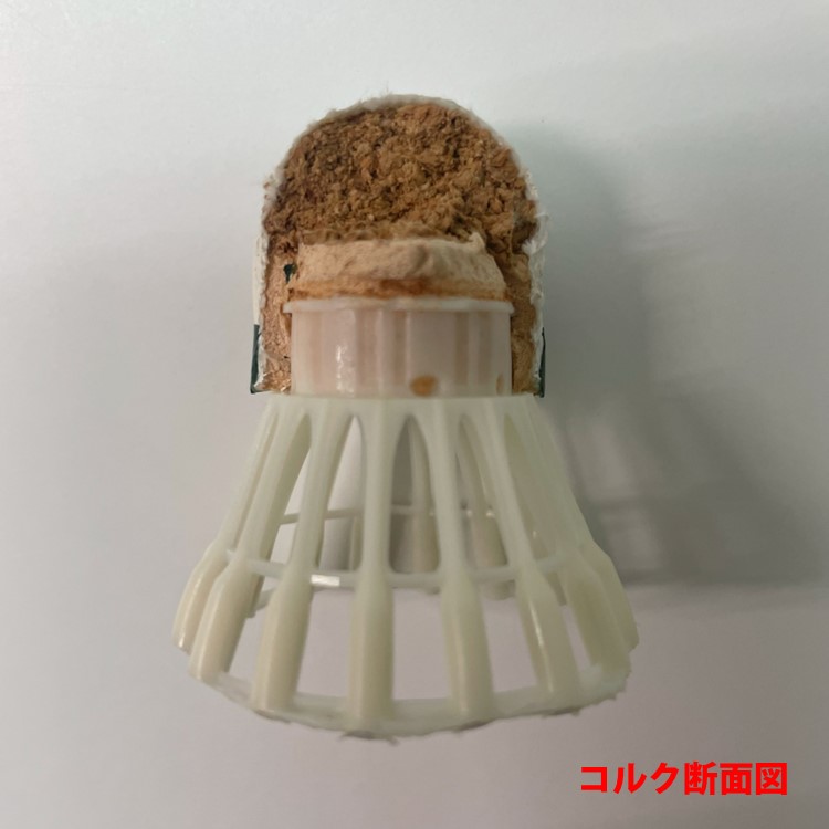 コルクと羽の間に、ポリアミドゲージというプラスティックの人工素材パーツを挟む事で、シャトルの強度が強くなり、耐久性に優れた構造になります